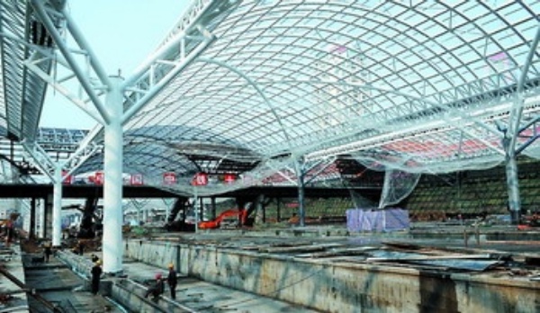 青岛火车站站台上方6.5万平方米无柱风雨棚的钢结构骨架已经全部搭建完毕。近日,新的青岛火车站主体工程全面完工,预计将于6月底正式启用。
