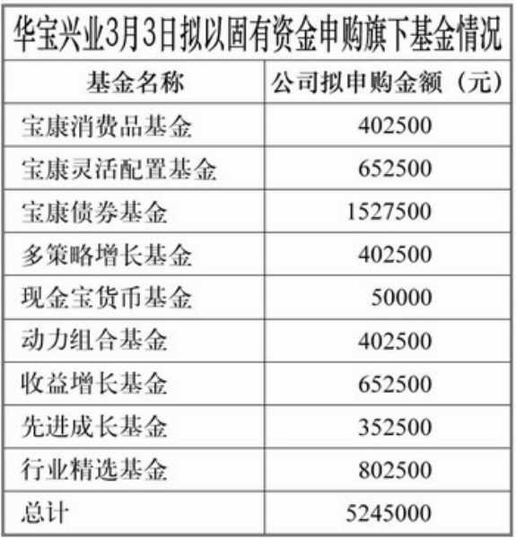 去年8月,华宝兴业首度启动“基金经理持基激励计划”时,公司和基金经理投入的资金总额为420万元。根据华宝兴业2月28日发布的运用公司固有资金投资旗下基金的公告,该公司拟动用总额达524.5万元的自有资金于3月3日申购旗下全部9只基金,每只基金申购金额5万元至150万元不等。华宝兴业基金管理公司总裁裴长江表示,此次申购的资金即为“持基激励计划”升级投入的资金。按1:1的配额比例计算,这意味着华宝兴业公司、基金经理和核心研究员此次投入“持基激励计划”的资金达到了1049万元,相当于初次投入金额的2.5倍之多。而华宝兴业公司及投研人员前后两次投入“持基激励计划”的全部资金已近1500万元。
