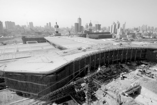 3月24日拍摄的天津站交通枢纽改造工程外景。近日,天津站交通枢纽改造工程初具规模,南北站房及候车大厅已进入内外装修阶段,无柱雨棚主体完工。 杨宝森摄 (新华社发)