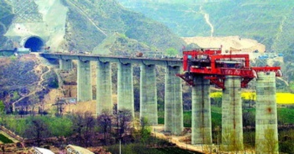 3月28日,在郑西铁路客运专线的一处施工现场,打钻隧洞和架设跨壑桥梁的工程正在同时施工。目前,郑西铁路客运专线进入了全面施工的关键阶段。 新华社记者 王 颂摄