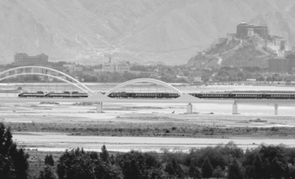 改革开放30年来,西藏经济社会快速发展,特别是青藏铁路通车及中印乃堆拉山口边贸通道恢复开通,使西藏经济“开放格局”日益凸显。这是2006年7月1日11时20分许,由拉萨发出的“藏2”次庆典列车通过拉萨河特大桥。当日,青藏铁路全线通车。 新华社记者 索朗罗布摄
