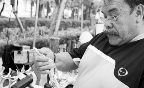 3月30日,在墨西哥首都墨西哥城举行的手工艺品博览会上,一名游客端详展出的手工艺品。为期5天的墨西哥城手工艺品博览会于当天闭幕。 新华社记者 马国强摄