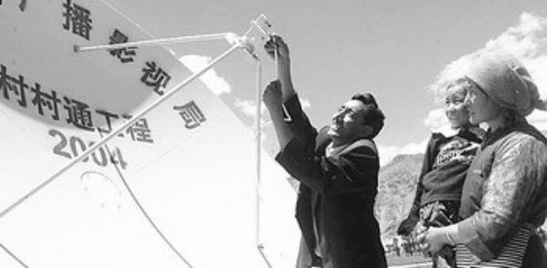 西藏采取多项惠农措施改善农牧区民生状况。图为2005年6月25日,西藏林周县边角林乡当杰村委会村级有线广播电视站农民技术员琼次仁(左)与家人一起调试电视接收设备。