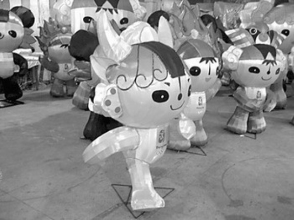 今年1月底,在广东省佛山市,曾创下两项吉尼斯世界纪录的灯色大师杨玉榕及20多名工匠忙碌了一个多月,精心制作了这一批包括70个奥运“福娃”及8组红灯笼、红色大拱门、五色和平鸽等在内的500多件花灯,最高的一件达3.3米,最矮的也有1.6米,件件细巧精美,形象逼真,令人叹服。