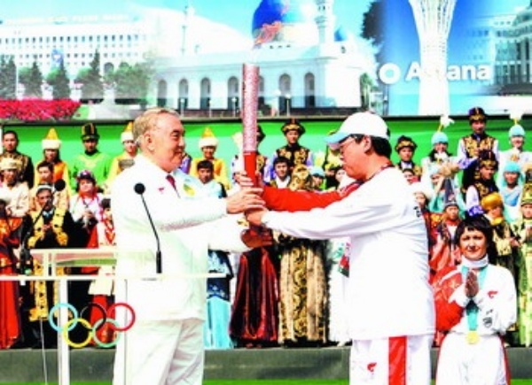 纳扎尔巴耶夫总统举起火炬微笑着向观众进行展示,然后迈着稳健的步伐跑下主席台,观众台上掌声雷动,欢呼声响成一片。北京奥运会火炬接力境外传递正式开始了。