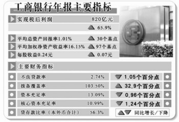 根据工商银行公布的2007年度经营业绩,按照国际财务报告准则,2007年工行实现税后利润人民币823亿元,同比增长64.9%(按照中国会计准则,2007年工行实现税后利润人民币820亿元,同比增长65.9%);每股收益为人民币0.24元,将向全体股东派发年末股息每股人民币0.133元。