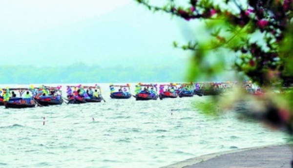 4月8日,众多载满游客的彩船在西湖上“游春”。当日,第二届西湖船会在杭州西湖举行,不同种类的约100艘船只亮相,来自全国各地的游人观看了这一场杭州早春特有的民俗活动。 新华社记者 王定昶摄