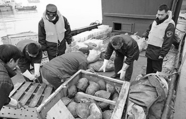 汕头海关日前查获大批涉嫌走私的闭壳龟、眼镜蛇、亚洲巨龟等活体野生动物。图为海关人员在查获现场。 黄勇哲摄