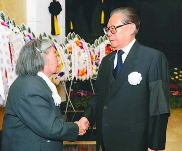 四月十日,吴学谦同志遗体在八宝山革命公墓火化。江泽民、温家宝、李长春、习近平、李克强等领导同志前往八宝山最后送别。这是江泽民同志同吴学谦亲属握手,表示深切慰问。     新华社记者 马占成摄