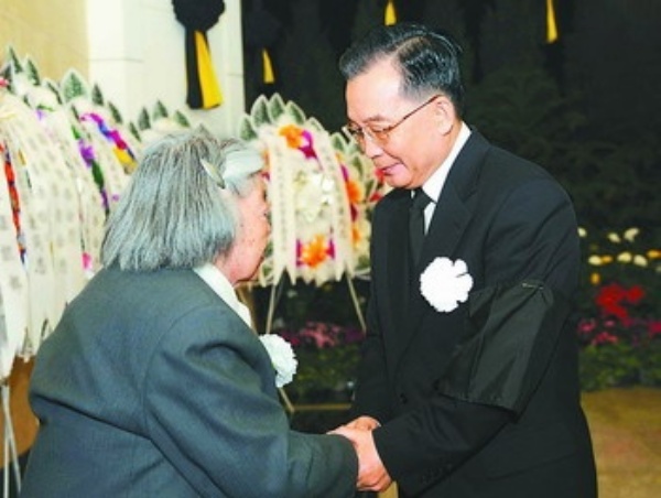 四月十日,吴学谦同志遗体在八宝山革命公墓火化。江泽民、温家宝、李长春、习近平、李克强等领导同志前往八宝山最后送别。这是温家宝同志同吴学谦亲属握手,表示深切慰问。  新华社记者 马占成摄
