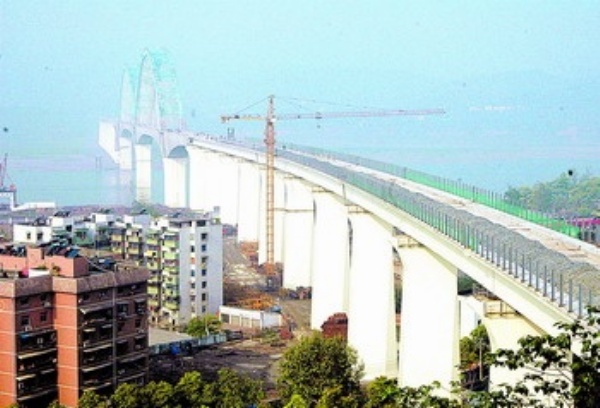 4月16日拍摄的建设中的宜万铁路宜昌长江大桥。当日,宜万铁路宜昌长江大桥铺轨石砟工程顺利结束。此后,大桥双线铁轨铺设将全面展开。
