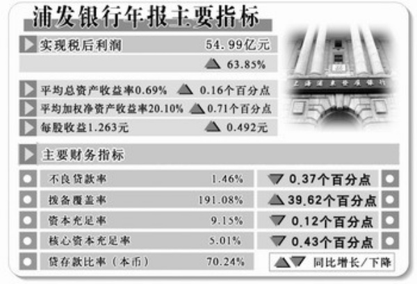 浦发银行2007年年报显示,公司2007年度实现净利润54.99亿元,同比增长63.85%;每股收益达到1.263元,同比增长63.81%;与此同时,资产质量进一步提高,不良贷款率降至1.46%。2007年净利润比上年增长63.85%,业绩增速比2006年翻一倍。