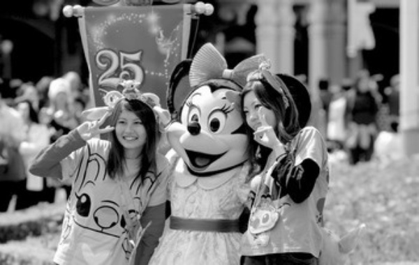 4月15日,在日本千叶县的东京迪斯尼乐园,游客同“米妮老鼠”合影。当天,东京迪斯尼乐园迎来25周岁生日。自1983年4月15日开园以来,东京迪斯尼乐园两个主题公园累计接待游客数量已达到4.36亿人次。