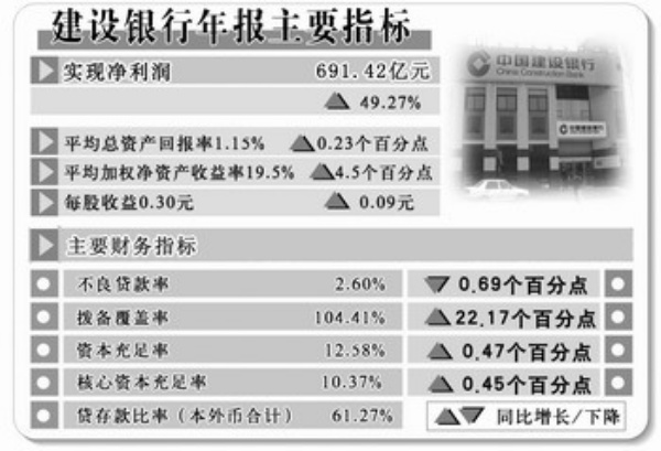 年报显示,该行2007年实现税前利润1008.16亿元,比上年增加350.99亿元,增长53.41%;实现净利润691.42亿元,比上年增加228.23亿元,增长49.27%;实现营业收入2194.59亿元,较上年增长46.10%;客户贷款及垫款总额为32721.57亿元,较上年增长13.87%。该行净利差为3.07%,净利息收益率达3.18%,在同业中处于较好水平;平均资产回报率为1.15%,加权平均净资产收益率为19.50%,分别比上年提高0.23个和4.50个百分点。