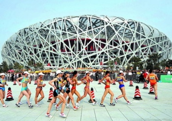 4月18日,运动员们在比赛中。当日,“好运北京”国际田联竞走挑战赛女子20公里比赛在国家体育场(鸟巢)举行,中国选手刘虹以1小时29分33秒的成绩夺得冠军。 新华社记者 刘大伟摄