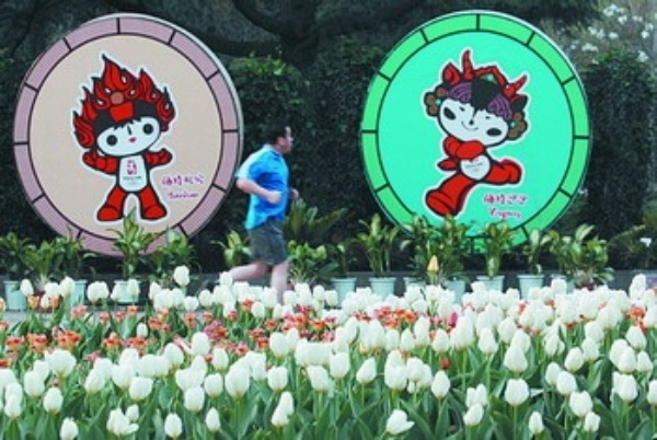 4月19日,晨练的市民从大连劳动公园盛开的鲜花前经过。当日,大连“2008迎奥运百花游园会”在大连劳动公园拉开帷幕。30万株竞相展瓣吐蕊的郁金香等花卉与观众见面。 刘德斌摄(新华社发)