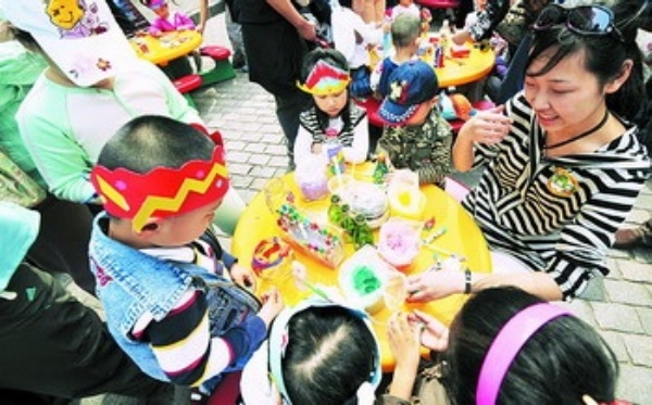 4月20日,小朋友们在老师的带领下用废旧物品进行手工制作。在第39个世界地球日将来临之际,哈尔滨市以“节能减排,全民参与”为主题举办了一系列环保教育活动。 新华社记者 李 勇摄