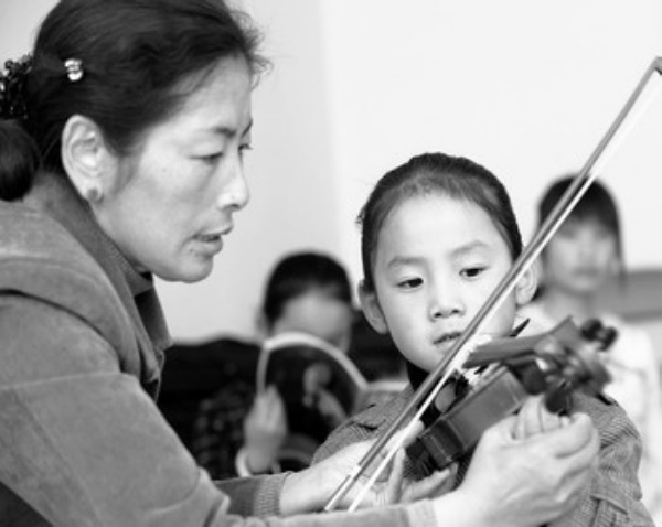 4月20日,在拉萨市少年宫,6岁藏族孩子央央在老师的指导下练习小提琴。到2007年底,西藏自治区在校小学生人数32.06万人,小学适龄儿童入学率达98.2%。 新华社记者 觉 果摄