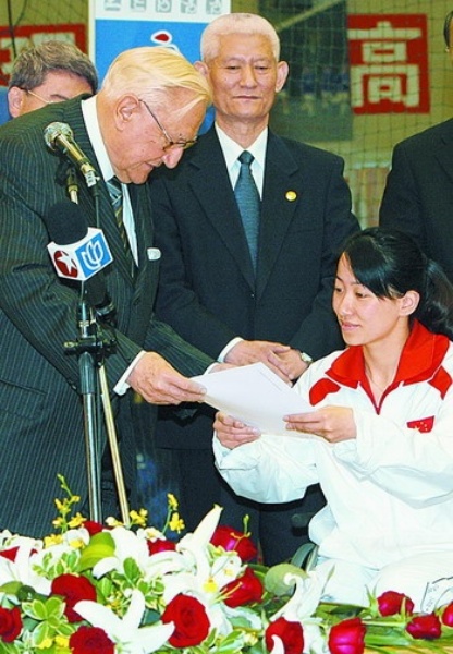 右图 4月21日,法国参议院议长克里斯蒂安·蓬斯莱(前左)向金晶转交法国总统萨科齐致金晶的慰问信。当日,来华访问的法国参议院议长克里斯蒂安·蓬斯莱专程到上海市残疾人体育训练中心看望中国奥运火炬手金晶。