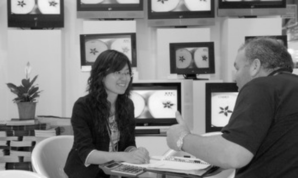 4月15日,一位中国参展商在琶洲展馆出口展区与外国客商交谈。