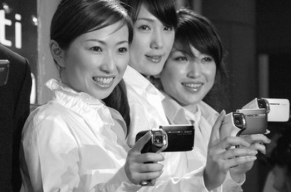 4月18日,几名模特在日本东京展示三洋电机公司推出的新款便携式防水摄像机。这种摄像机采用立体形状密封圈,麦克风和扬声器部分选用防水的多孔薄膜,在1.5米深的水下可连续工作1小时。新华社记者 钱 铮摄
