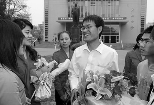 4月16日,志愿者代表在北京与大学生交流志愿服务的体会。 新华社发
