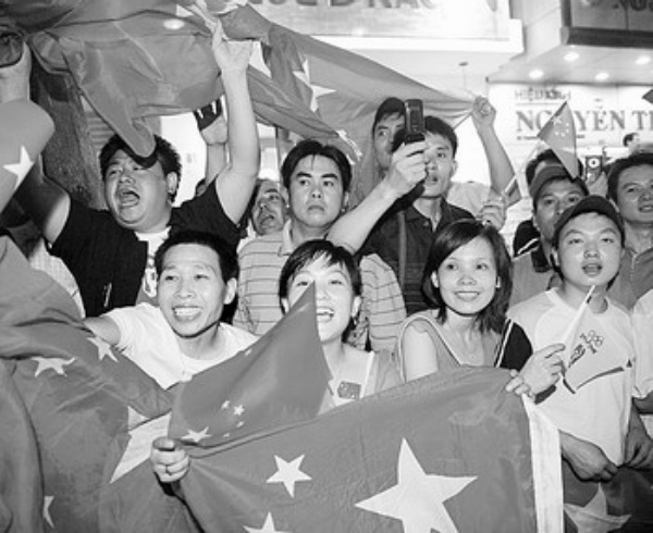 4月29日,观众为奥运圣火传递活动加油。当日,北京奥运圣火传递活动在越南胡志明市举行。 新华社记者 周文杰摄