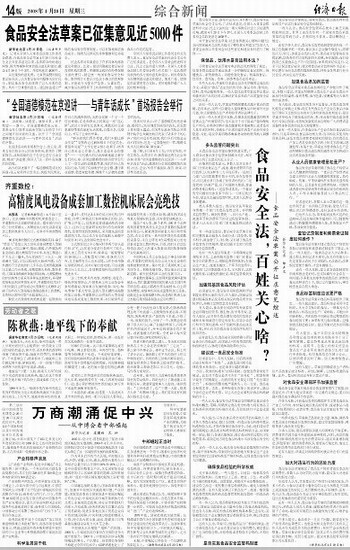 食品安全立法,备受社会关注。4月20日,食品安全法草案向社会全文公布,广泛征求意见。全国人大常委会推进科学立法、民主立法的这一重大举措在社会上引起强烈反响。截至4月29日下午3时,全国人大常委会法制工作委员会共收到意见4838件。