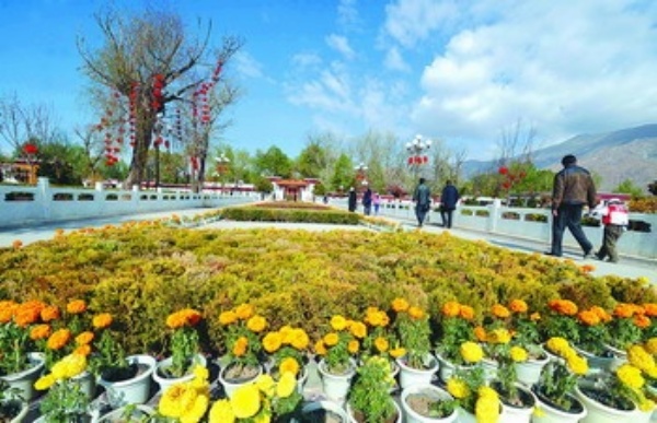 5月1日,游客从拉萨一处景点的花坛边走过。随着天气转暖,拉萨迎来旅游的好时节,各地游客纷纷来到拉萨欣赏雪域高原的魅力。 新华社记者 觉 果摄