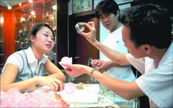 龙岗三联水晶玉石文化村,客户在挑选翡翠产品。近年来,当地政府引导利用水晶玉石加工这个自发形成的市场优势,打造水晶玉石销售平台和品牌,这里已形成拥有近300家生产加工企业、150家销售门店、从业人员近3000人的水晶玉石生产加工基地。