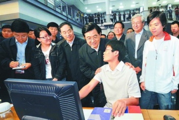 胡锦涛来到图书馆,走到学生们中间,大家非常欣喜,纷纷向总书记问好。胡锦涛微笑着与学生们握手,并同大家交谈起来,询问他们在念几年级、学什么专业。看到学生们专心致志学习的情景,总书记十分欣慰。
