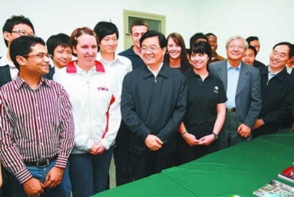 胡锦涛很关心外国留学生的学习生活情况。他专门来到42号楼学生宿舍,看望北京大学—耶鲁大学联合本科生项目培养的学生。宿舍里,来自耶鲁大学的留学生明鸿凯和北京大学学生张引正在学习。胡锦涛在床上坐下,同他们促膝交谈。