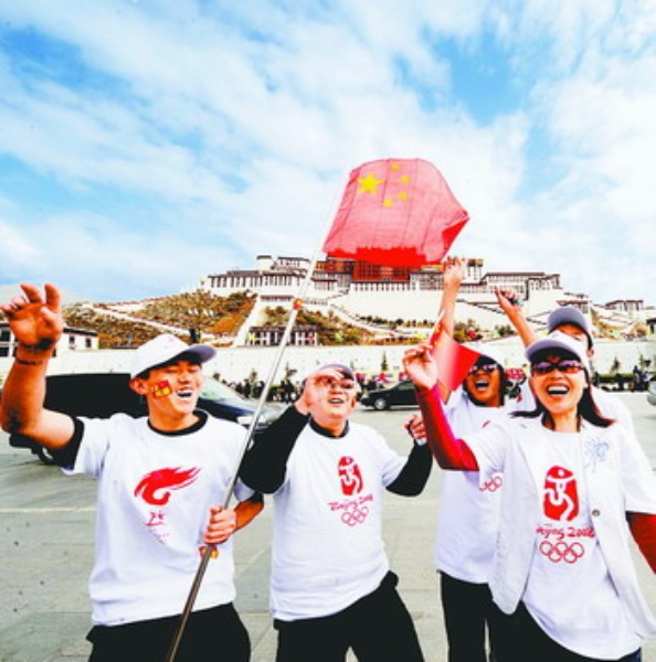 4日上午,青年志愿者们骑着自行车、电动车,手持国旗和奥运会旗,分别沿不同的路线,在拉萨市区内行进,一边走一边呼喊“北京加油、奥运加油”,并向路边的人散发“奥运情、中国心”宣传单,向他们赠送奥运文化衫、国旗和奥运旗。