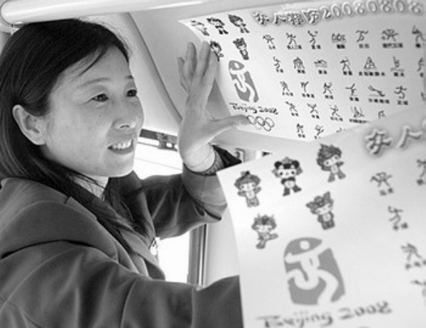 河北石家庄211路公交车的工作人员正在车厢张贴自己制作的奥运宣传画。目前,石家庄大部分公交车都已张贴了这样的“流动奥运宣传画”。 本报记者 赵 晶摄