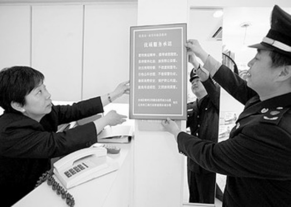 4月30日,北京市东城区“银街”60商户做出“迎奥运,诚信体验在银街”优质服务承诺。图为工商分局工作人员为“大明眼镜店”悬挂“迎奥运,诚信体验在银街”承诺书。 罗伟摄