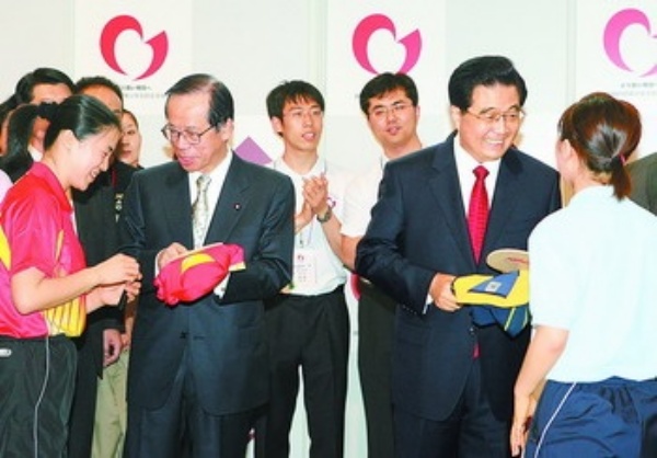 开幕式结束后,胡锦涛和福田康夫来到国际交流中心,同在那里的中日青年进行了交流。胡锦涛还同著名乒乓球运动员王楠、福原爱展开了乒乓球友谊赛。