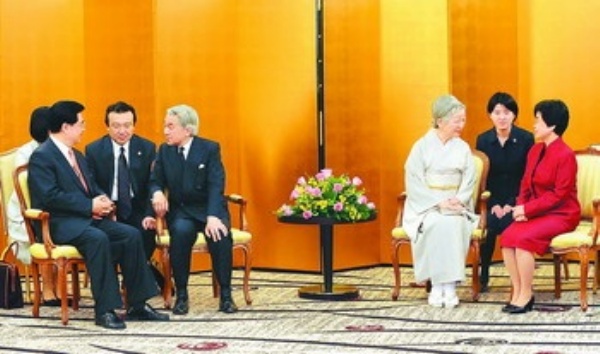 明仁天皇表示,很高兴看到胡主席同福田首相的会谈取得丰硕成果。回顾日中友好交往悠久历史并在此基础上展望未来十分重要。胡主席即将访问奈良的法隆寺,法隆寺包含佛教文化的精髓,佛教就是从西域经丝绸之路传到日本的。我们首先应好好学习历史,在此基础上进一步促进世界各国的友好关系。明仁天皇衷心祝愿日中关系不断取得发展,两国人民世代友好。