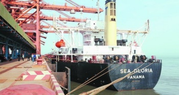 4月8日,一艘外轮停泊在唐山港曹妃甸港区25万吨码头卸货。