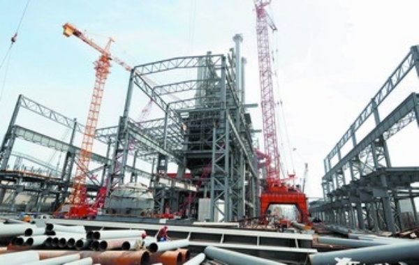 这是建设中的首钢京唐钢铁厂。日前,为落户河北省曹妃甸工业区的首钢新厂首钢京唐钢铁厂炼铁提供重要原料的A焦化炉已点火烘炉运行,5500立方米的高炉开始安装煤气回收设备,这标志着大规模建设的首钢京唐钢铁公司开始进入投产准备阶段。 新华社记者 杨世尧摄