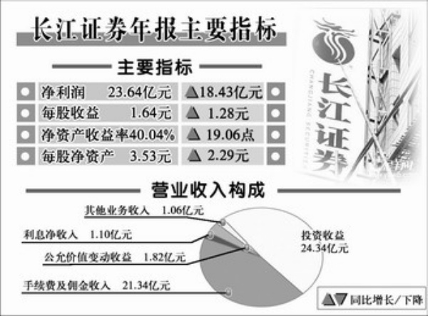 长江证券2007年年报显示,公司全年营业收入为49.62亿元,其中手续费、佣金净收入和投资收益各占一半,手续费、佣金净收入为21.34亿元,比上年增长300.35%,主要来自市场交易量的增加,其中又以代理买卖证券业务净收入的20.80亿元为主;投资收益总额为24.34亿元,同比增长228.28%,公允价值变动收益1.82亿元,投资收益率从57%提高到103%,促使公司去年投资收益大幅增长。两项收入之和占2007年总收入的90%。