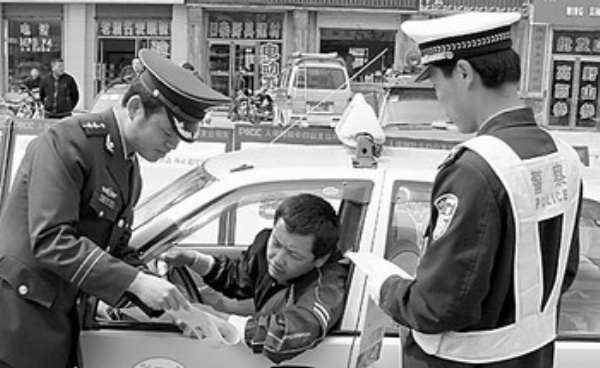 4月25日,吉林延边边防支队安图大队的武警(左)与长白山管理委员会交警支队的交警一起向辖区内出租车司机讲解行车注意事项。(据新华社)