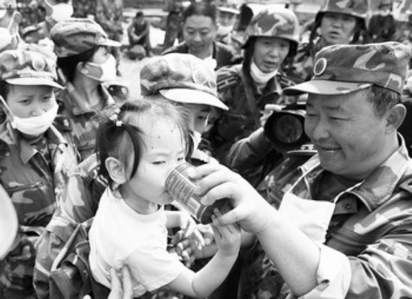 左图 5月15日,子弟兵在给刚刚从北川地震灾区救出的儿童喂饮料。当日,前来抢险救灾的子弟兵在汶川地震重灾区北川展开紧张的搜救工作。 新华社记者 杨世尧摄