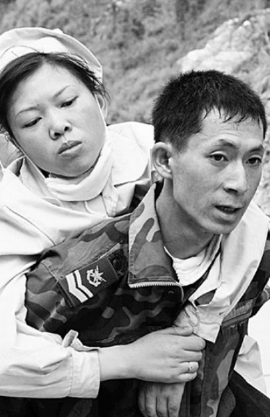 上图 5月15日下午,在北川县连续数日抢救受灾群众的医疗队女护士累得晕倒在地,参加抢险救灾的解放军战士闻讯立即背着她赶住1公里外的救治点抢救。 本报记者 李江天摄