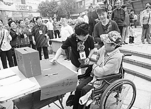 | 重庆各界市民自发在街头巷尾设立抗灾募捐点,图为70多岁的重庆市民张大妈在现场捐款。