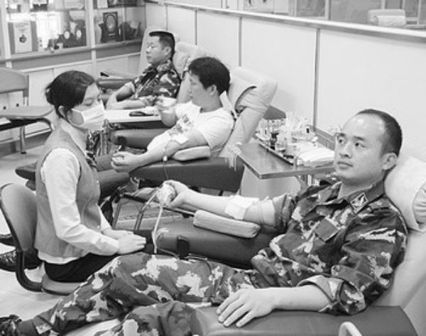 上图 四川地震灾情发生后,深圳边防七支队官兵们到深圳市第二人民医院为灾区义务献血。 本报记者 杨阳腾 通讯员 廖 键摄影报道