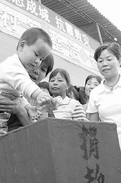 右图 15日上午,西安市灞桥区红旗街道办五星村村民踊跃为灾区人民捐款献爱心。 本报记者 张 毅 通讯员 王 平摄影报道