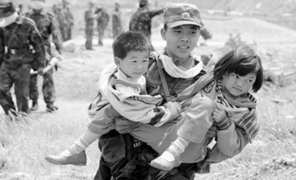 “叔叔,水……”什邡市蓥华镇中学女生廖友瑶被埋在废墟中,官兵们经过24个小时的撬、挖、掏、抬,终于给她送上了第一口水,又经过11个小时的努力,终于将她救了出来……