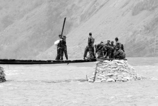 5月17日,解放军某部官兵在平武县南坝镇修建通往该镇的桥梁。修建完毕后,大批救援物资和人员可以通过此桥进入灾区。新华社记者 赵颖全摄