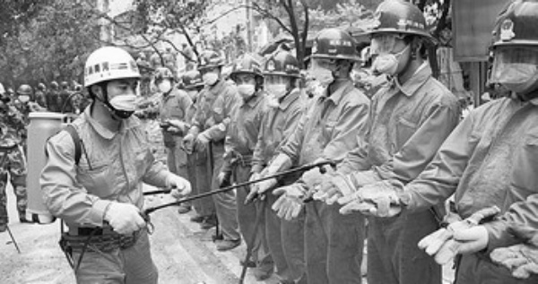 5月17日,绵竹灾区救援队员在搜救工作结束后接受全身消毒。新华社记者 裴 鑫摄