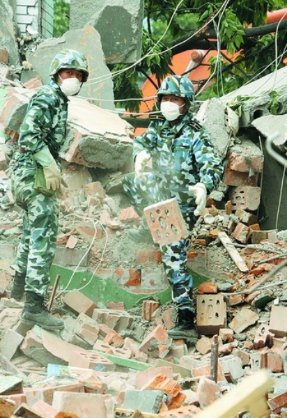 5月17日,解放军海军陆战队队员冒着余震的危险,在地震重灾区之一的绵竹市汉旺镇东汽中学的废墟里搜救。新华社记者 查春明摄